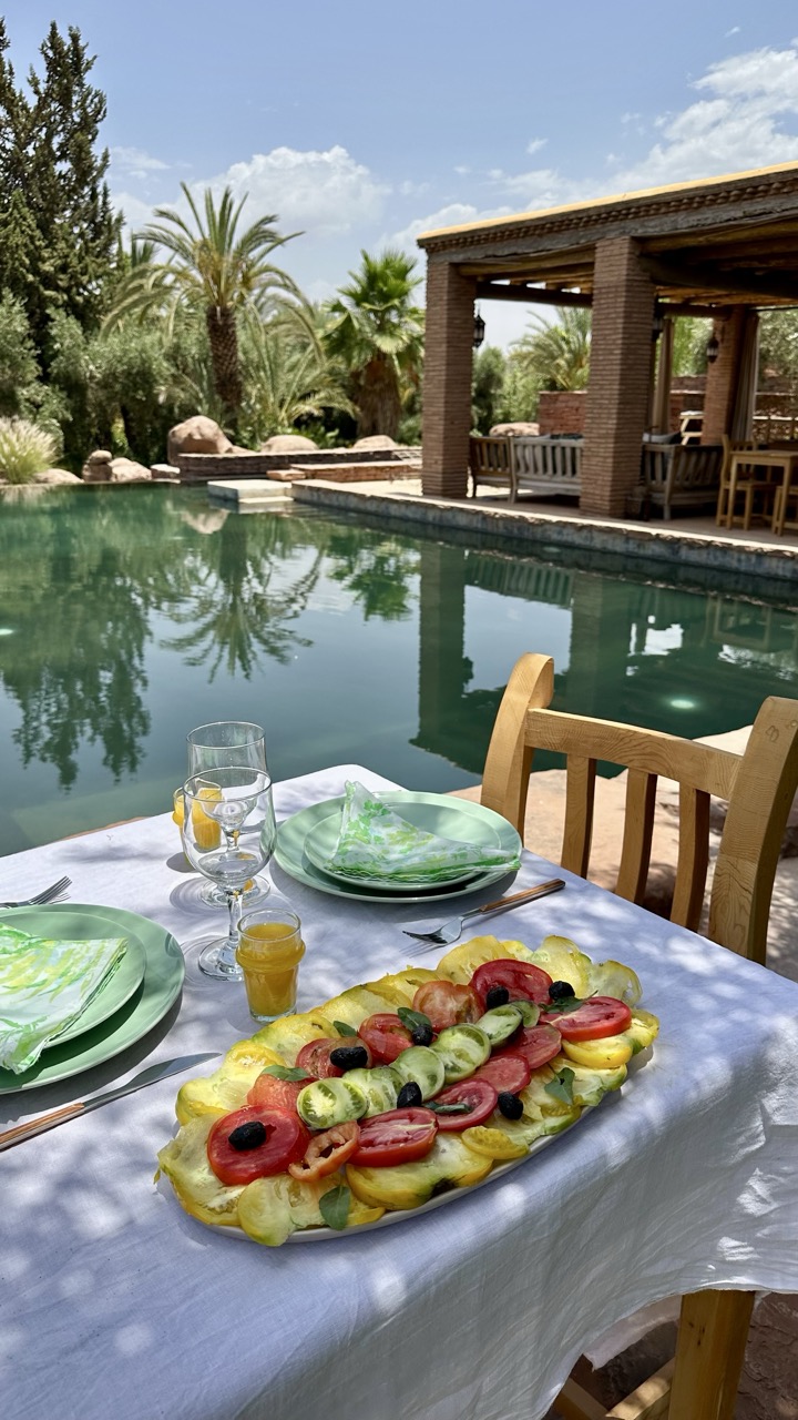 Der Garten des Riads ist nicht nur wunderschön – er lebt. Hier wachsen saisonales Gemüse, frische Kräuter und Früchte, die direkt in der Küche verarbeitet werden. Das Soul Food, das wir gemeinsam geniessen, kommt direkt aus dem Boden unter deinen Füssen – nährend für Körper und Seele.